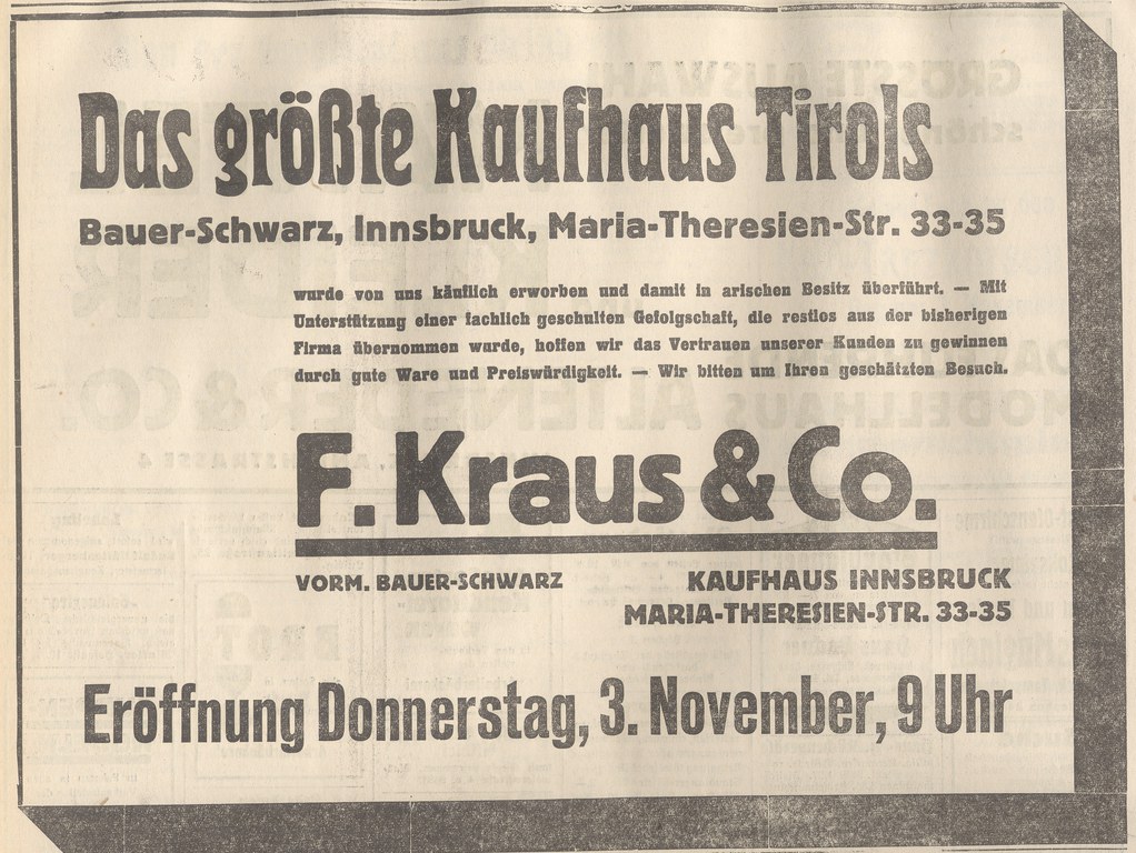 Bald nach der Machtergreifung der NSDAP beschmierten Mitglieder der SA die Auslagen jüdischer Geschäfte mit der Aufschrift „Jude“. Die Bevölkerung wurde aufgerufen, dort nicht mehr einzukaufen, der Umsatz ging stark zurück. Die NS-Behörden setzten „kommissarische Verwalter“ ein, die so manchen Betrieb in den Ruin trieben, weil sie nur auf den eigenen Nutzen bedacht oder einfach unfähig waren. Die auf diese Weise heruntergewirtschafteten Geschäfte mussten von ihren jüdischen Eigentümern weit unter dem tatsächlichen Wert verkauft werden. Der Abschluss des Kaufvertrages erfolgte nicht freiwillig, sondern unter großem Druck. Vom ohnedies geringen Erlös aus dem Verkauf des Betriebes mussten Phantasiesteuern (Judenvermögensabgabe, Reichsfluchtsteuer) bezahlt werden, sodass den ehemaligen Besitzern nur noch ein kleiner Betrag übrig blieb. Auf diese Weise entzogen die Nationalsozialisten der jüdischen Bevölkerung nach und nach ihre Existenzgrundlage.
