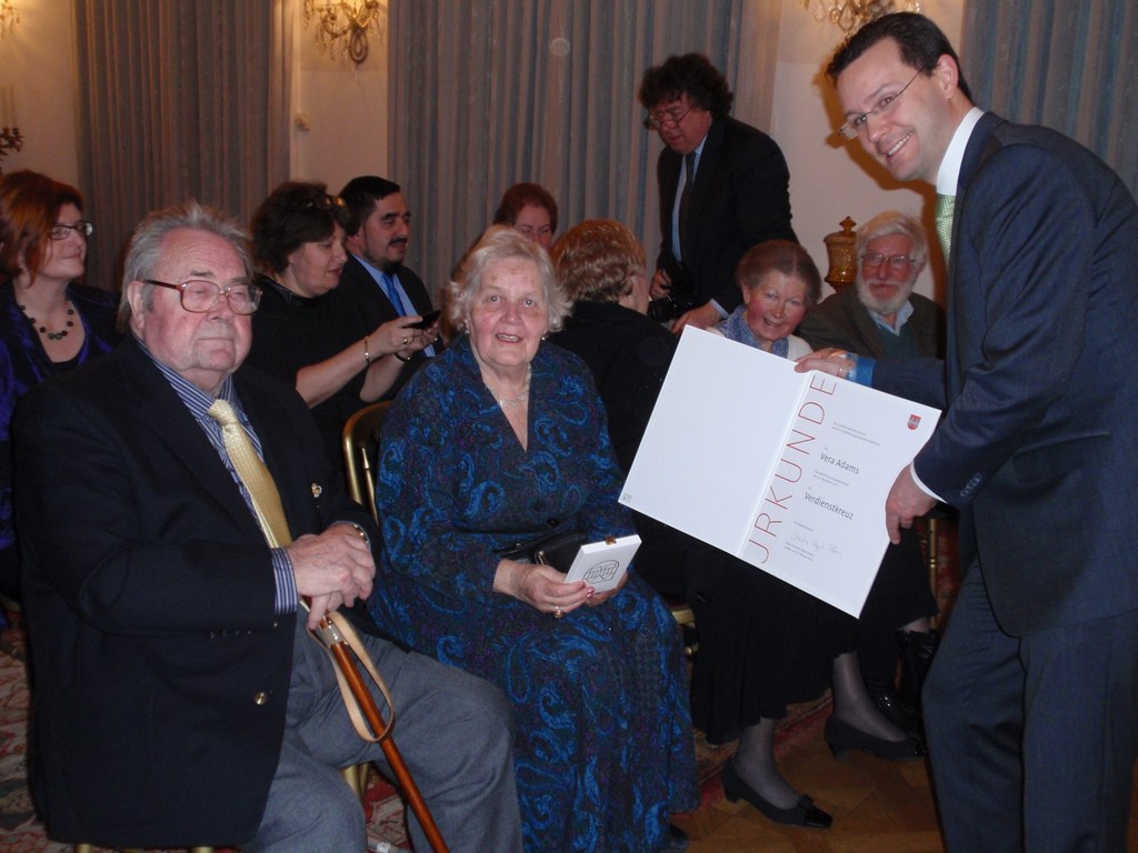 Vera Adams, geb. 1929 in Innsbruck als Vera Schwarz, kommt zusammen mit ihrem älteren Bruder Karl-Heinz mit einem von den Quäkern organisierten Kindertransport nach England. Ihrem Vater Ernst Schwarz gelingt 1939 die Flucht nach England. Vera lernt mehrere Sprachen, arbeitet als Sekretärin, Rezeptionistin, Fremdenführerin und Sprachlehrerin. Sie lebt 2017 in Plymouth, England.