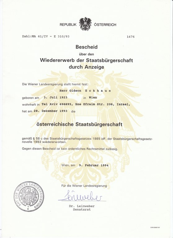 Der Vater wurde in Auschwitz ermordet, Gideons Bruder überlebte den Holocaust in den USA. Gideon Eckhaus beteiligte sich aktiv am Aufbau des Staates Israel, zunächst als Mitglied der Jewish Settlement Police und der Haganah (der jüdischen Untergrundarmee), später im Militär und in der Arbeit mit jugendlichen Neueinwanderern. Er bezeichnet sich selbst als überzeugten Zionisten. Er war maßgeblich an den Restitutionsverhandlungen mit der österreichischen Regierung beteiligt und zum Zeitpunkt des Interviews schon seit vielen Jahren Vorsitzender des Zentralkomitees der Österreicher in Israel.