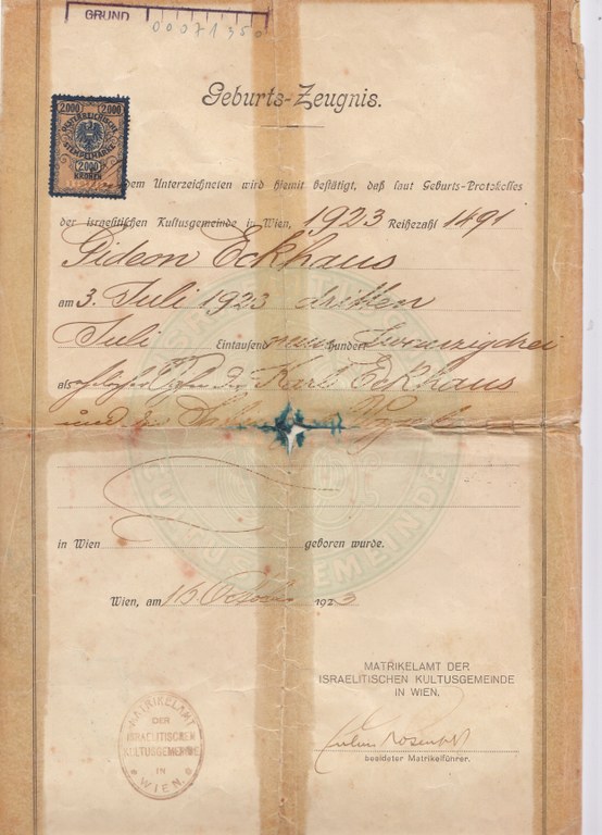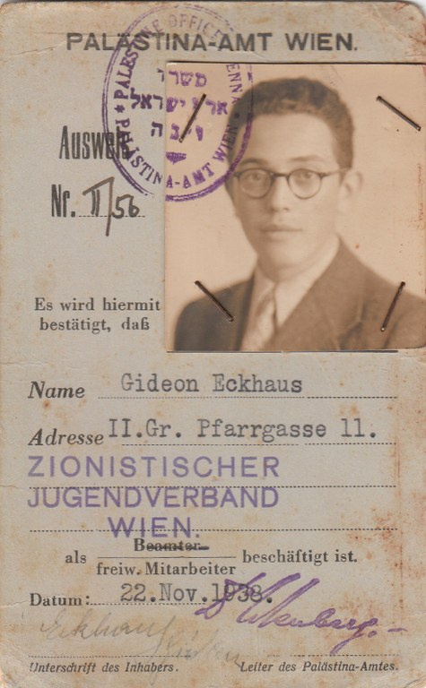 Geboren 1923 in Wien als Sohn des Kaufmanns Karl Eckhaus und seiner Frau Sabine. Weil seine Mutter schon 1934 verstarb und sein Vater häufig auf Geschäftsreisen war, lebten er und sein Bruder bei ihrer Großmutter. Nach der NS-Machtergreifung 1938 wurde die Firma des Vaters "arisiert". Das und der Novemberpogrom wenige Monate später bestärkten den gerade 15-Jährigen in seinem Entschluss zu fliehen. 1935 war Gideon Mitglied im zionistischen Jugendverband geworden – seither ist die Ausreise nach Palästina im Rahmen der Jugend-Alijah für ihn ein Ziel. Doch die Umstände hatte er sich anders vorgestellt, denn 1938 wurde aus der freiwilligen Ausreise eine Flucht vor den Verfolgern. Er gelangte in Triest auf ein Schiff und schließlich nach Palästina.